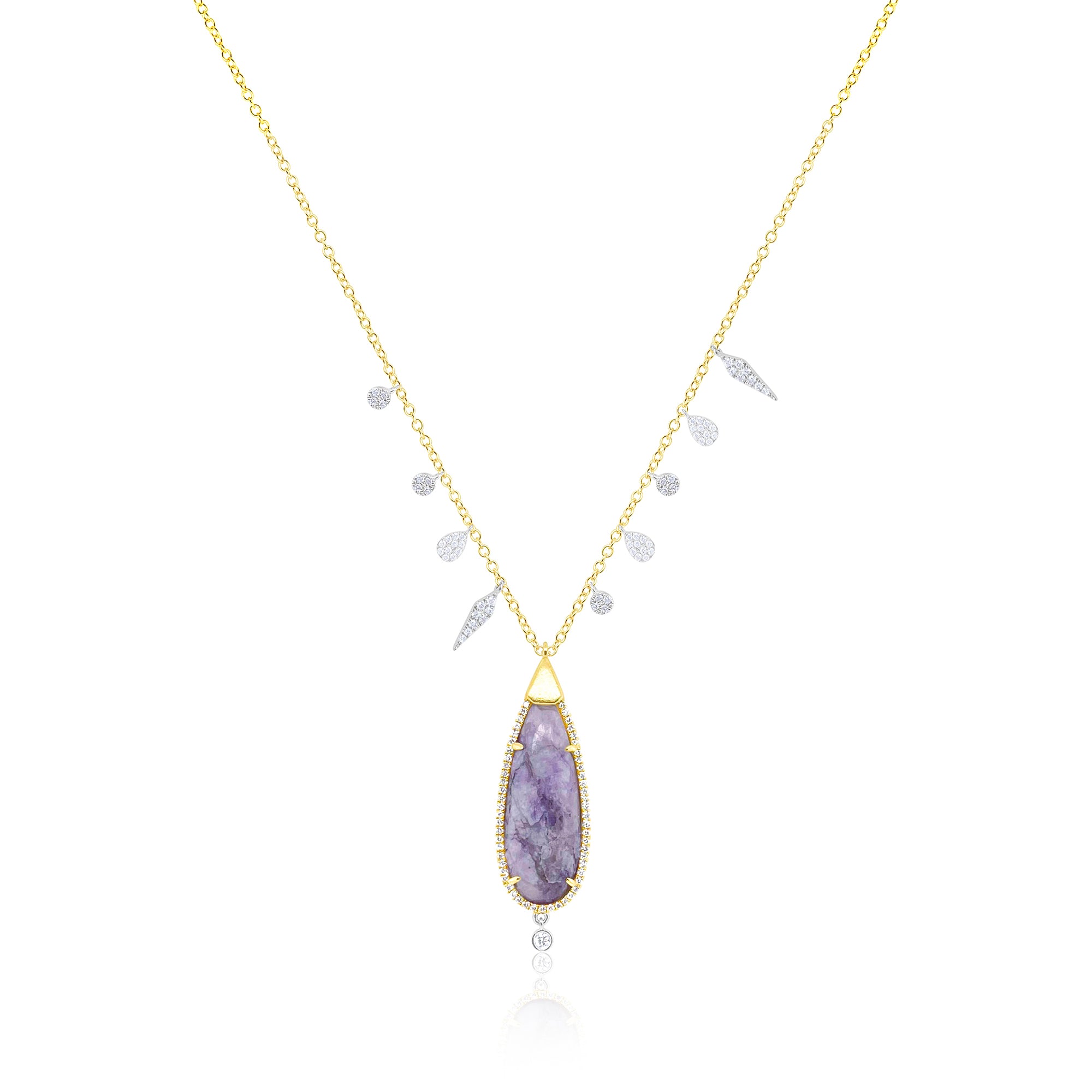 This elegant necklace features a stunning purple jasper centerpiece set in lustrous 14kt yellow gold, accented with delicate diamonds for a refined sparkle. Its unique combination of precious metals and natural stone offers a sophisticated touch, perfect for elevating both everyday and special occasion looks.