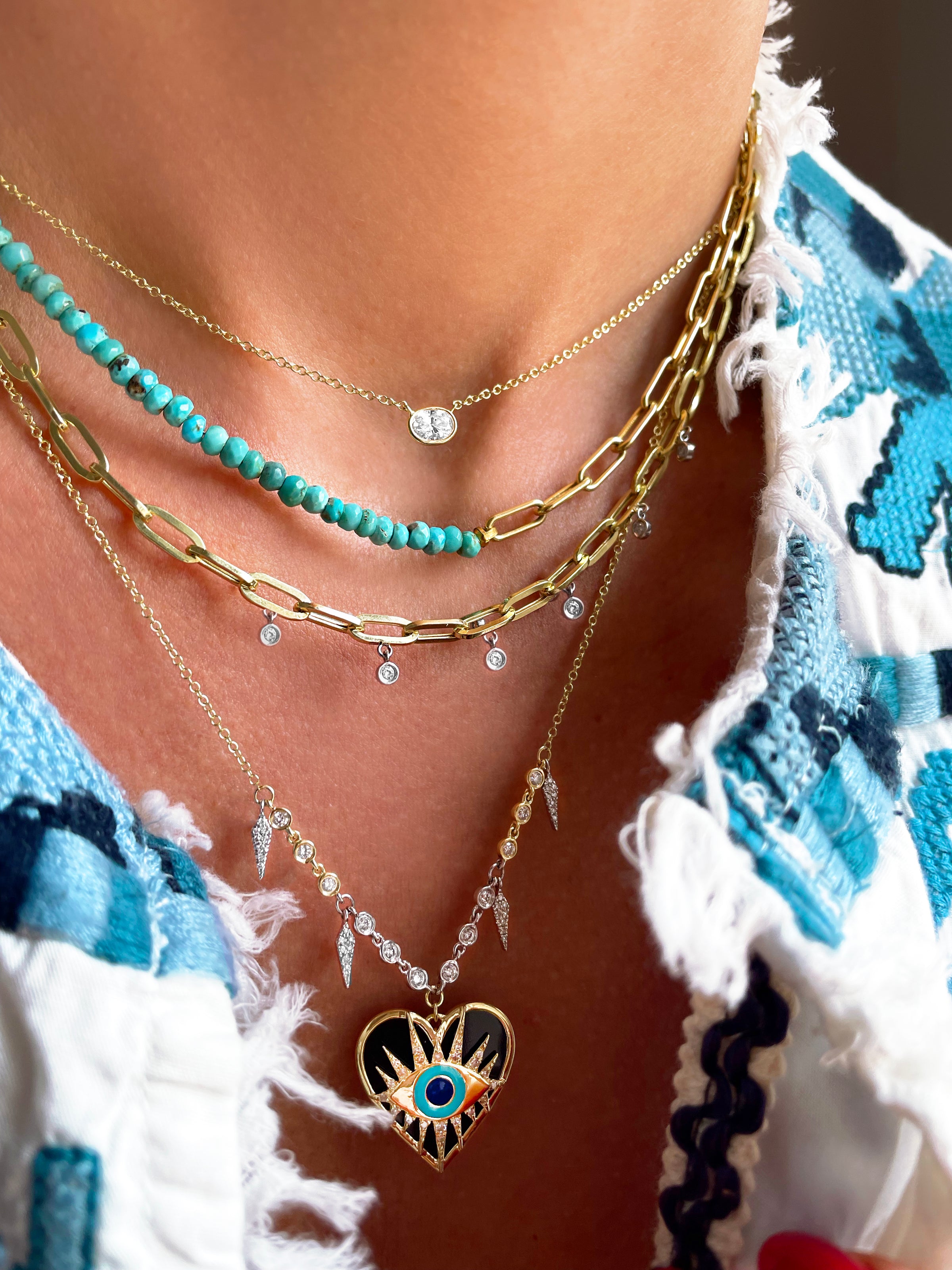 This stunning 14k yellow gold necklace features a center enamel heart with a diamond encrusted evil eye and side diamond details.