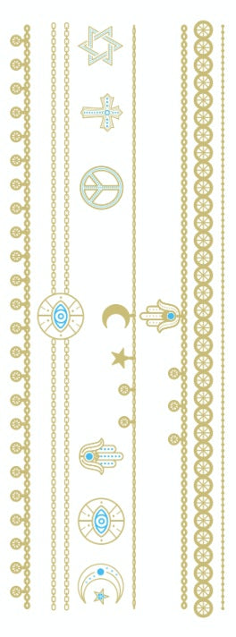 Featuring delicate linework and soft gold tones accented by Meira T’s signature pops of turquoise blue, each tattoo mirrors the symbols that define the brand: