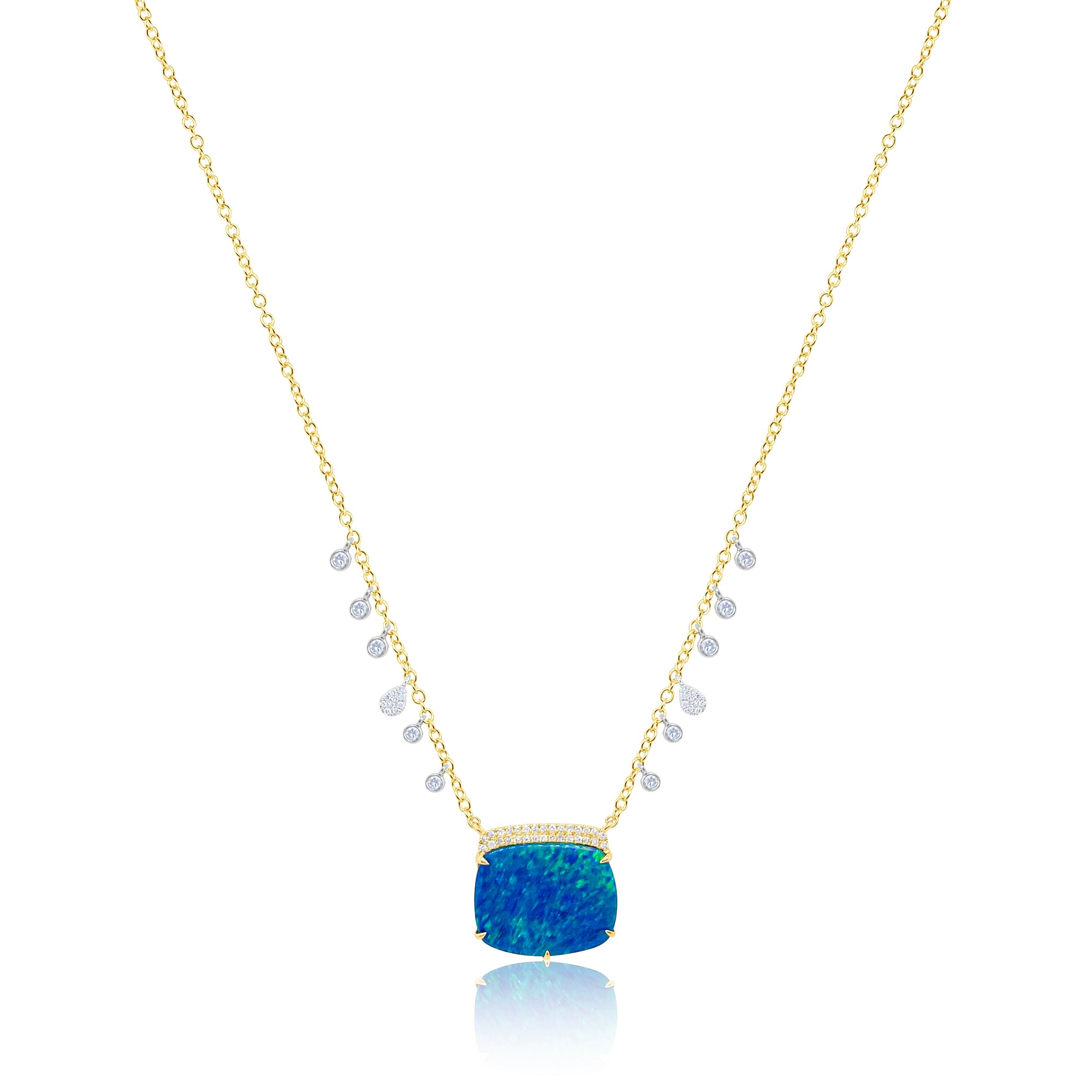 Discover understated luxury with this refined 14kt yellow gold necklace, showcasing a captivating opal centerpiece complemented by brilliant diamonds and charming accents. The opal's iridescent play of color brings natural beauty and movement to your neckline, while precisely set diamonds enhance its radiance with timeless sparkle. The thoughtfully designed charms add an element of personal expression and visual intrigue. Crafted for the discerning wearer who appreciates quality and elegance, this piece transitions seamlessly from day to evening, making it an invaluable addition to any sophisticated jewelry wardrobe.