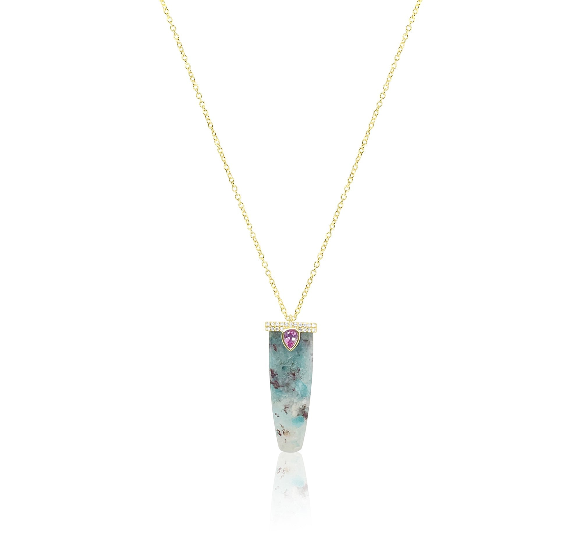 This 14kt yellow gold necklace features a delicate charm adorned with vibrant amazonite and sparkling pink sapphires. Its refined design adds a subtle yet elegant touch, making it perfect for elevating any outfit with a hint of color and sophistication.