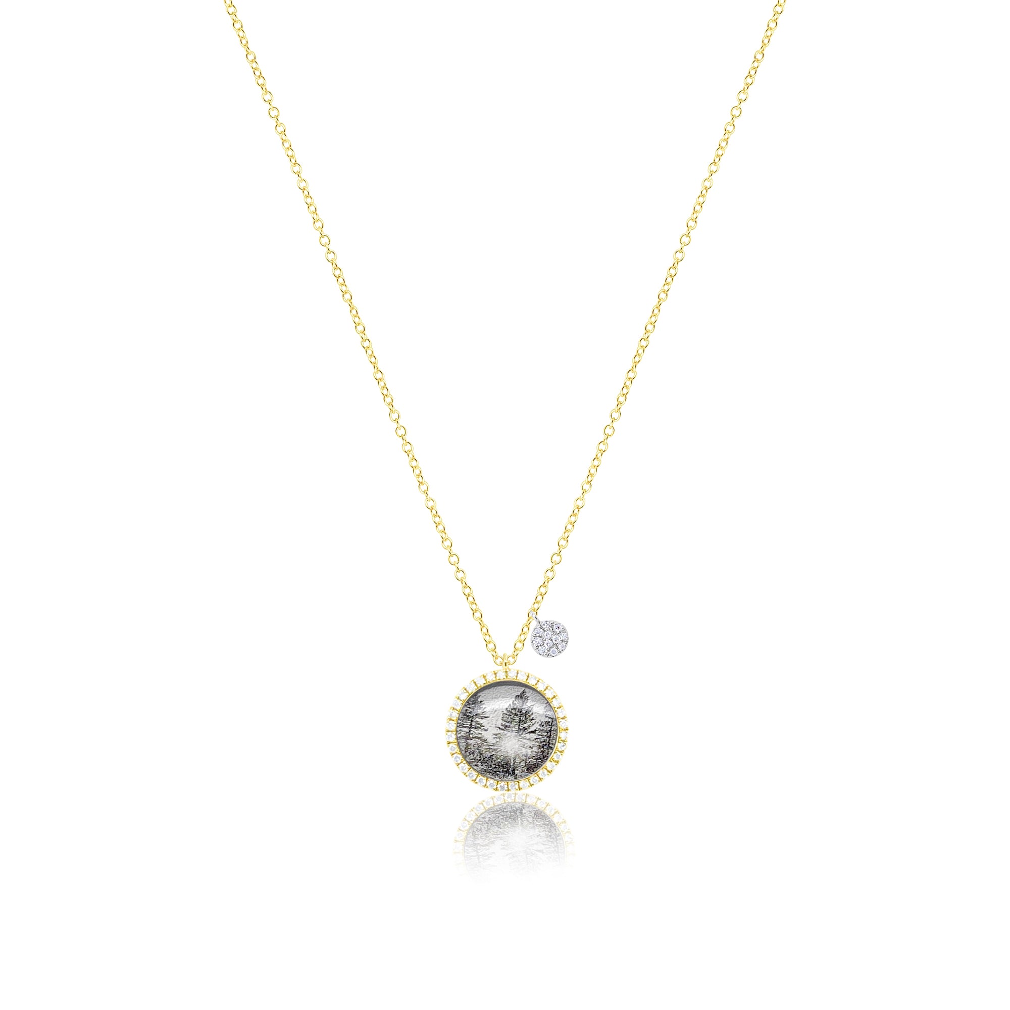 This elegant necklace features a delicate lithograph tree pendant crafted in sterling silver, accented with a sparkling diamond. The intricate tree design captures nature's beauty in refined detail, making it a timeless piece that transitions effortlessly from everyday wear to special occasions. The combination of precious metal and gemstone creates a sophisticated aesthetic that complements any wardrobe. Perfect for those who appreciate meaningful jewelry with artistic flair.