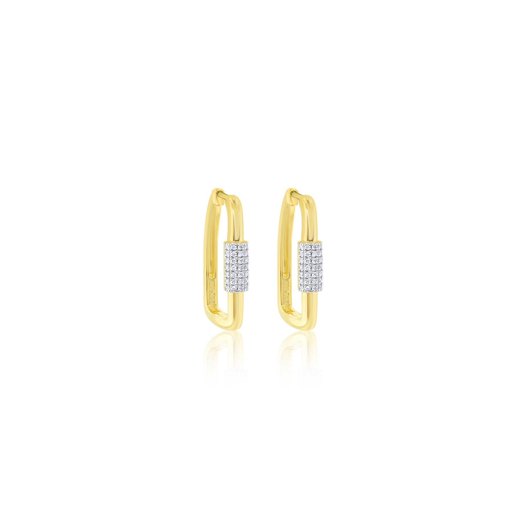 These sleek 14K gold rectangular huggies feature a modern open-link silhouette accented with a shimmering pavé diamond bar. Lightweight, elegant, and perfect for everyday wear or layering.