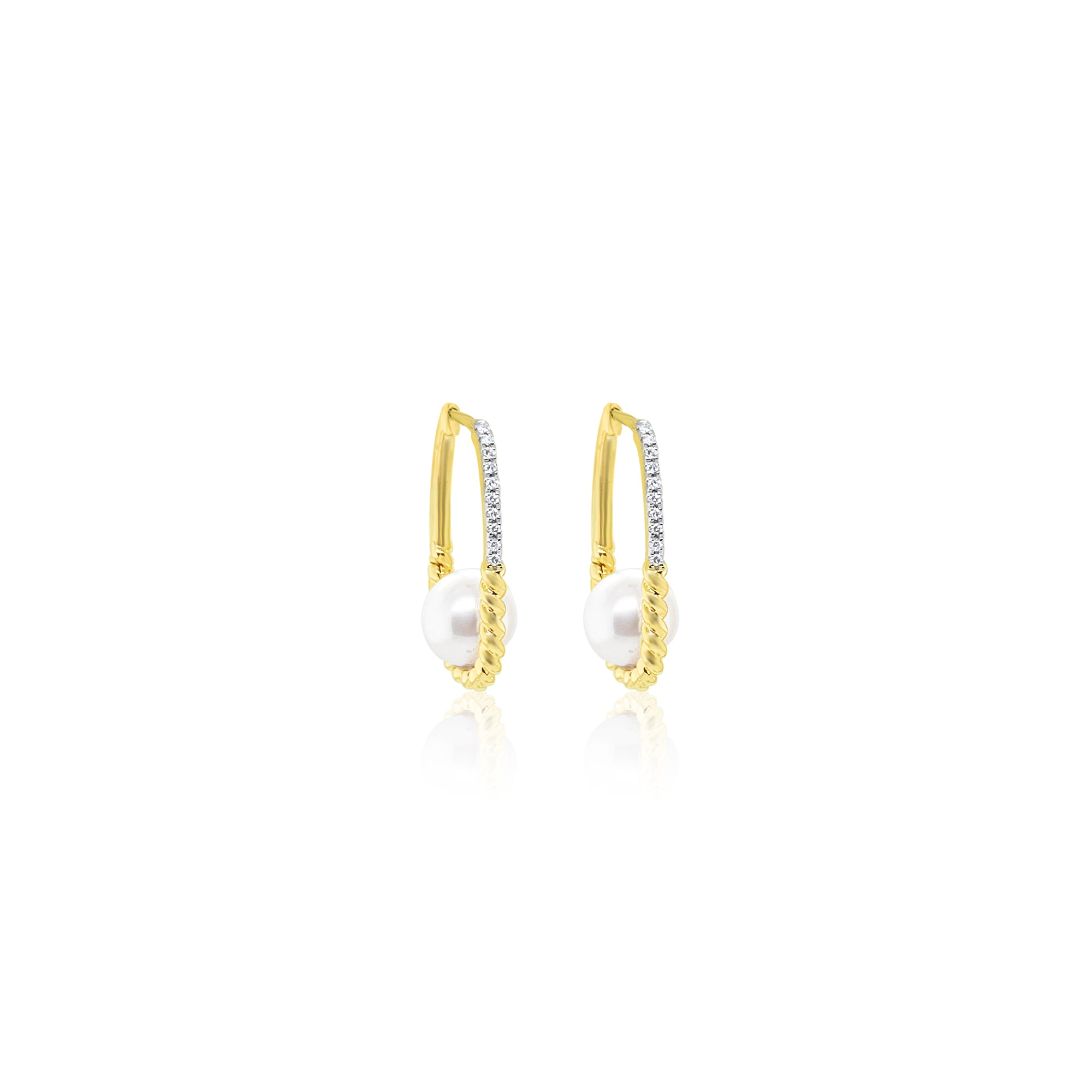 Elegant 14K gold huggies featuring a luminous pearl framed by a twisted gold loop and a delicate row of shimmering diamonds. A timeless blend of classic beauty and modern sparkle.