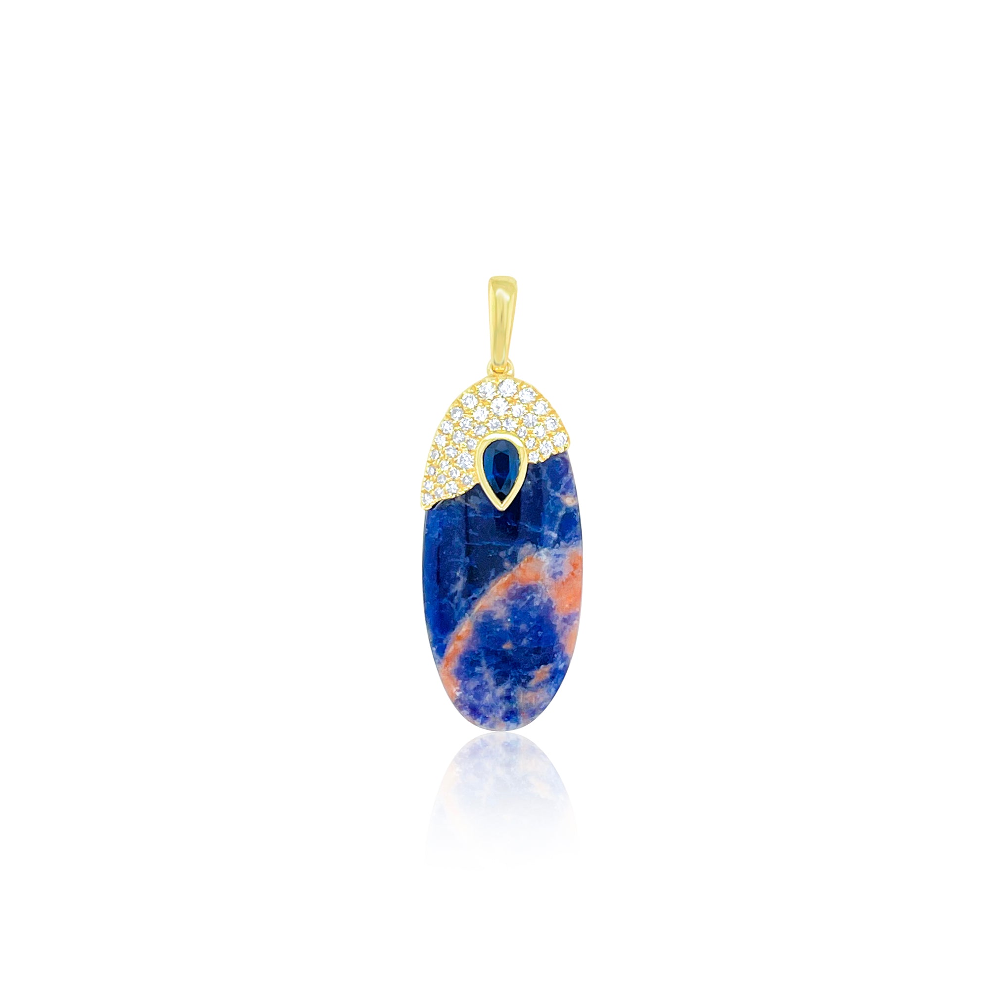 A striking Sodalite gemstone is hand-cut into an elongated oval and crowned with a 14k gold diamond-pavé cap, finished with a pear-shaped natural sapphire accent.