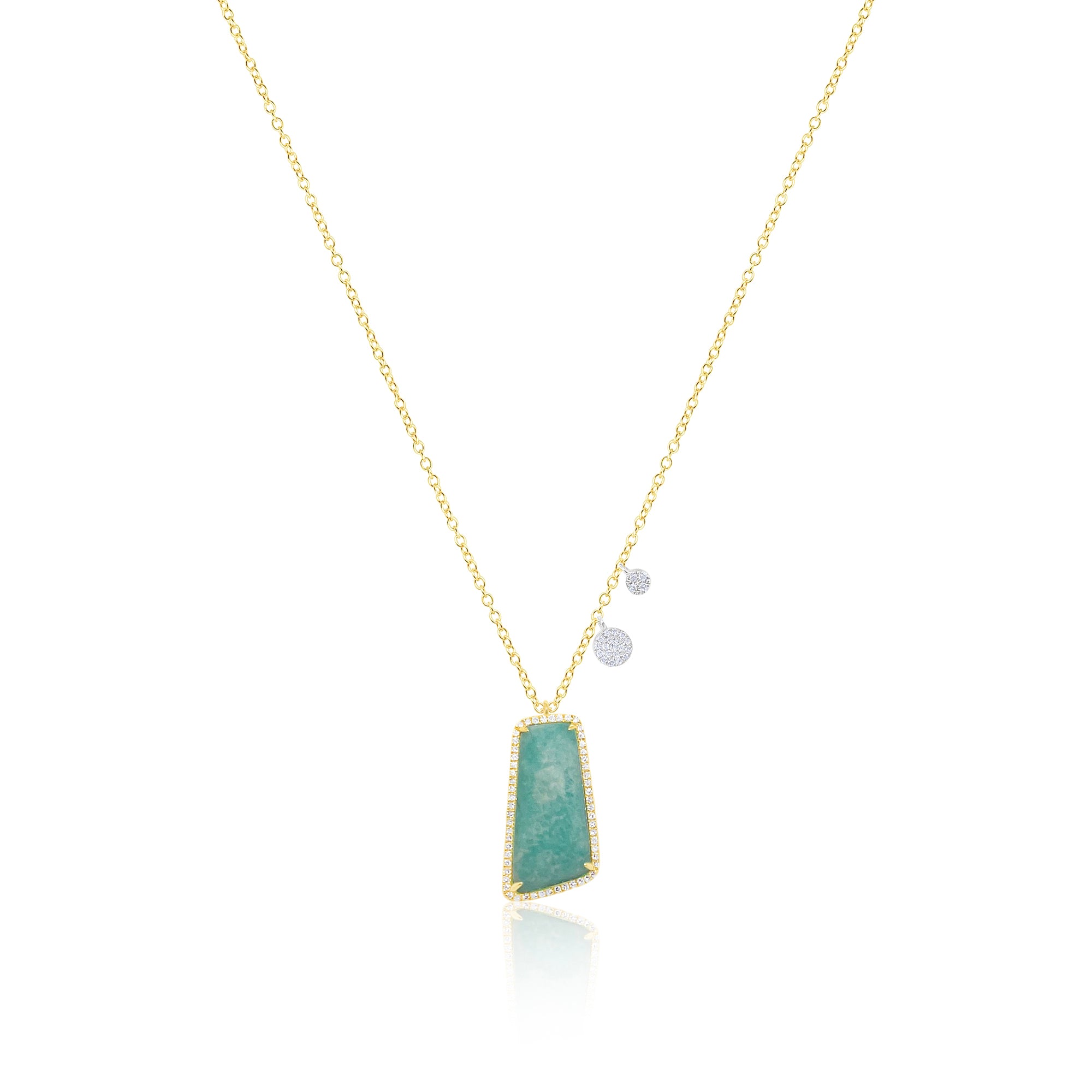14k yellow gold necklace with an amazonite center surrounded by diamonds and diamond disc charms along the chain.