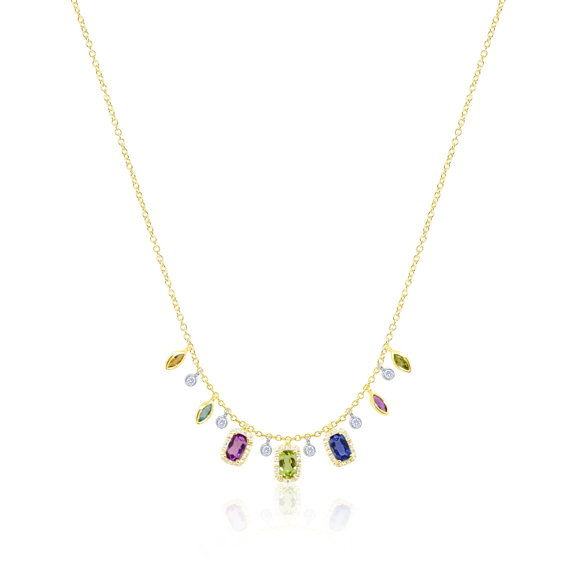 This refined yellow gold necklace showcases a captivating trio of precious gemstones: deep tanzanite, rich sapphire, and luminous peridot. Expertly set in warm yellow gold, these complementary gems create a sophisticated statement piece that transitions seamlessly from day to evening wear. A luxurious choice for those who appreciate fine gemstone artistry.