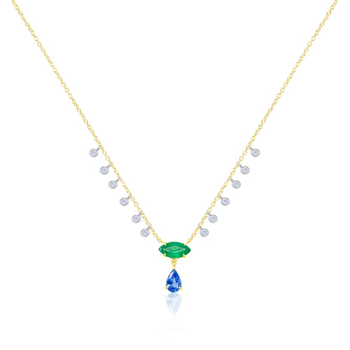 Yellow Gold Blue Sapphire Emerald and Diamond Necklace