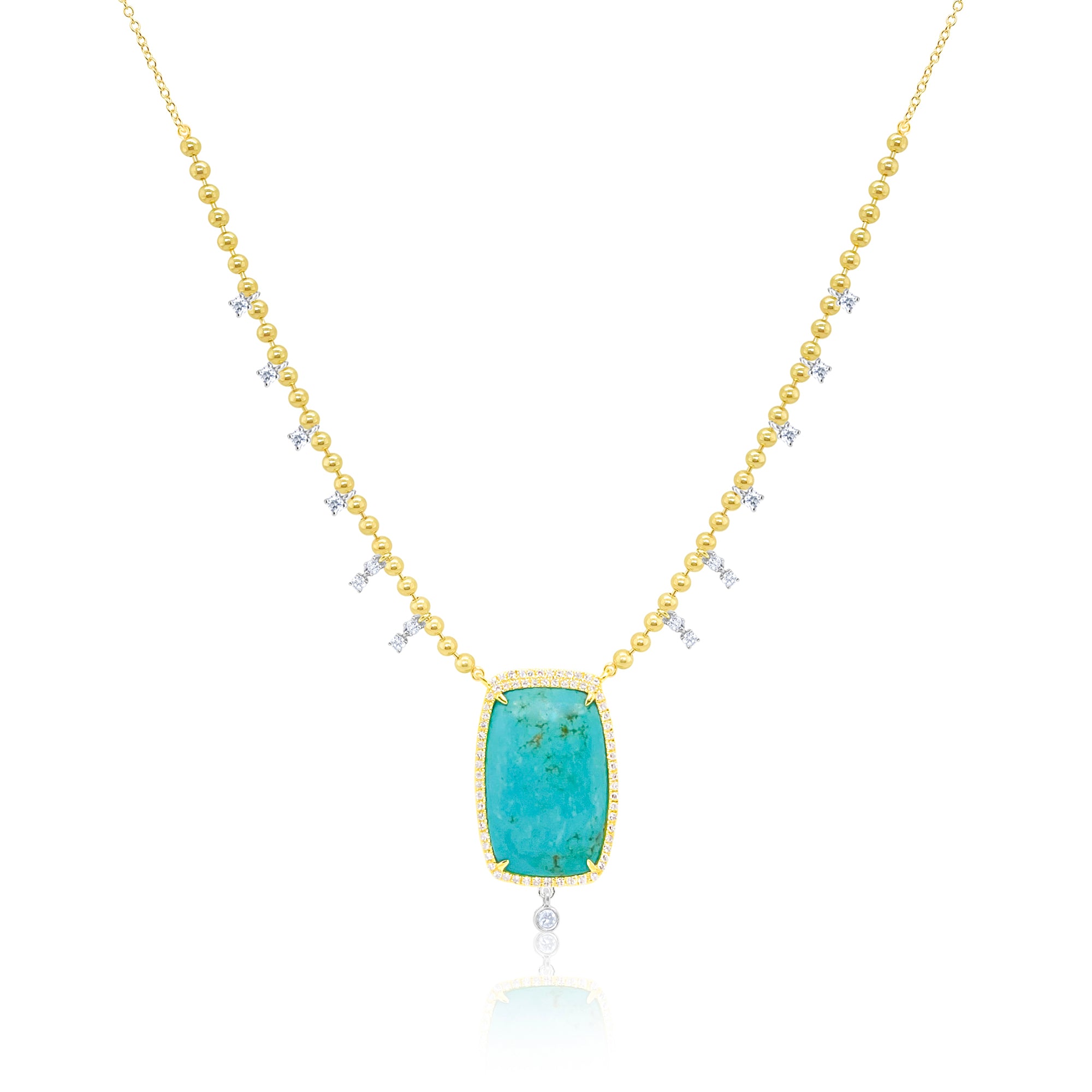 Crafted in 14k gold and diamonds, this trendy ball chain necklace features a large natural turquoise center.