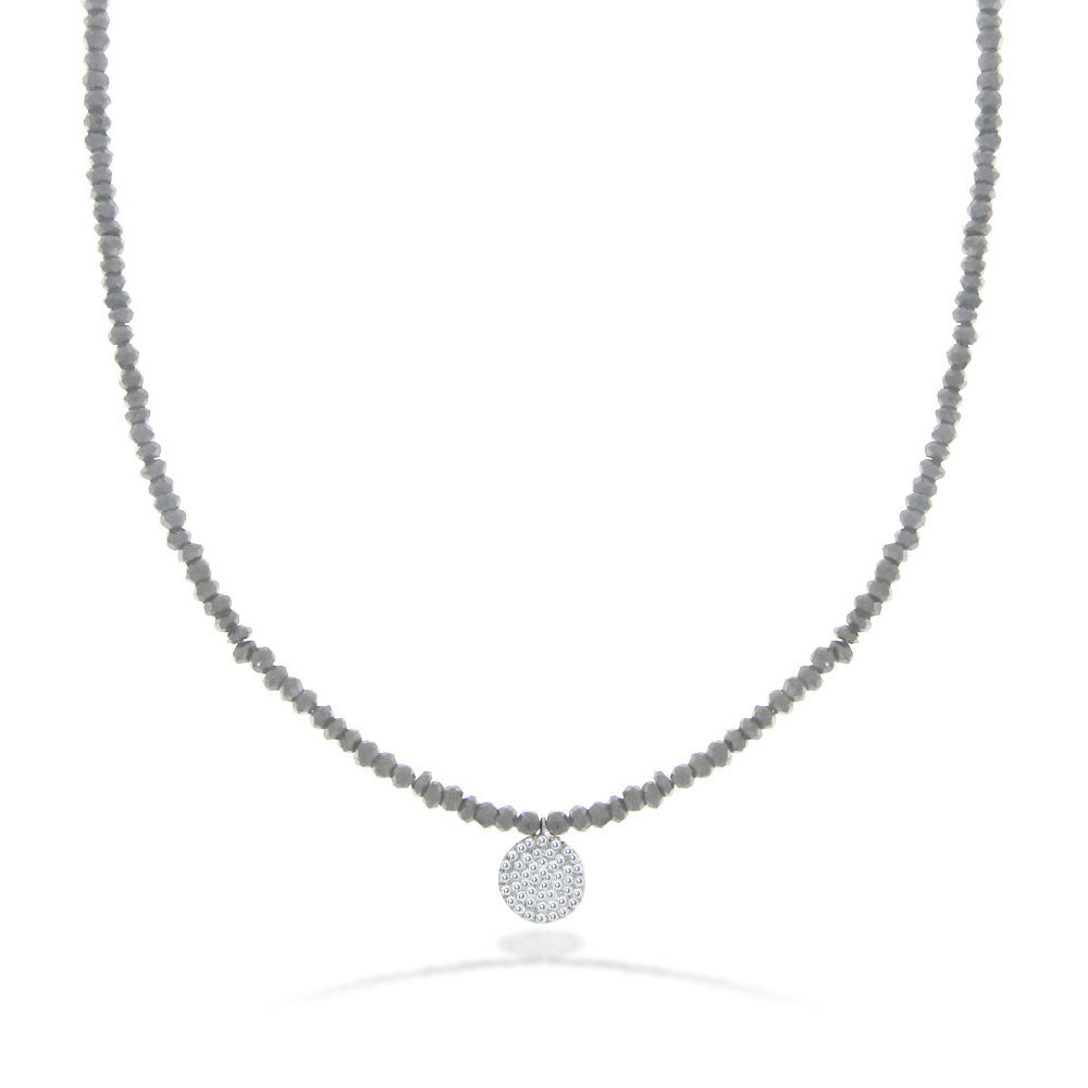 This unique piece has labradorite beads all around and a yellow gold, diamond encrusted disk.