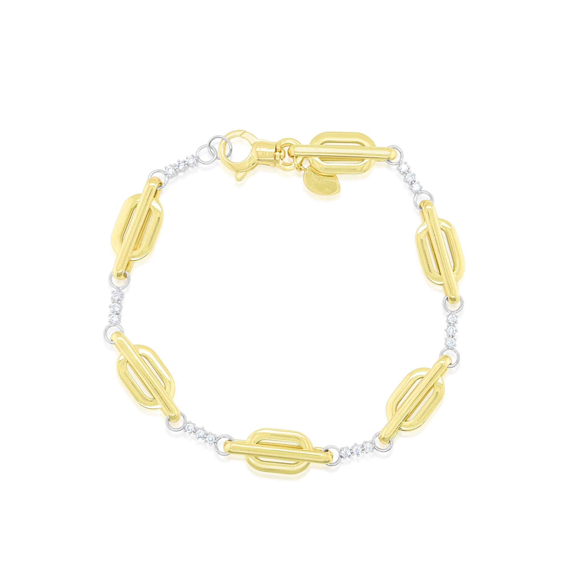 Elevate your everyday style with this bold yet refined 14K gold chunky link bracelet, designed for the modern trend-setter. Featuring a series of signature geometric links, this piece blends contemporary edge with timeless luxury. Sparkling .18 carats of natural diamonds add the perfect touch of brilliance, catching light with every movement.