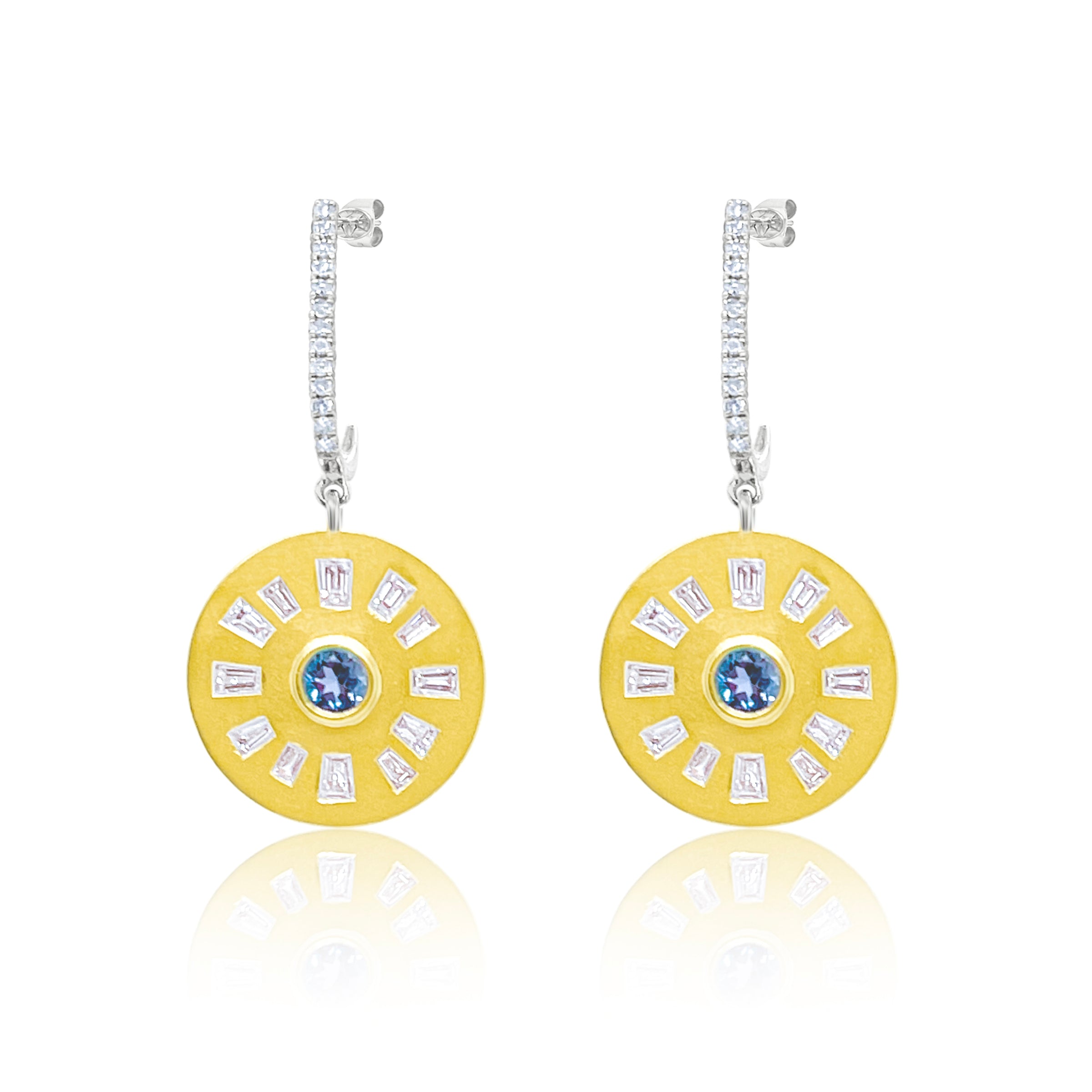 Elevate your jewelry collection with these refined yellow gold earrings, featuring elegant baguette-cut diamonds paired with striking blue topaz stones. The sophisticated interplay of brilliant diamonds and vibrant blue creates a timeless yet contemporary aesthetic. Perfect for both special occasions and elevated everyday wear, these earrings showcase exceptional craftsmanship and luxurious design. The warm glow of yellow gold complements the cool tones of the gemstones, delivering a balanced, polished look that exudes understated elegance.