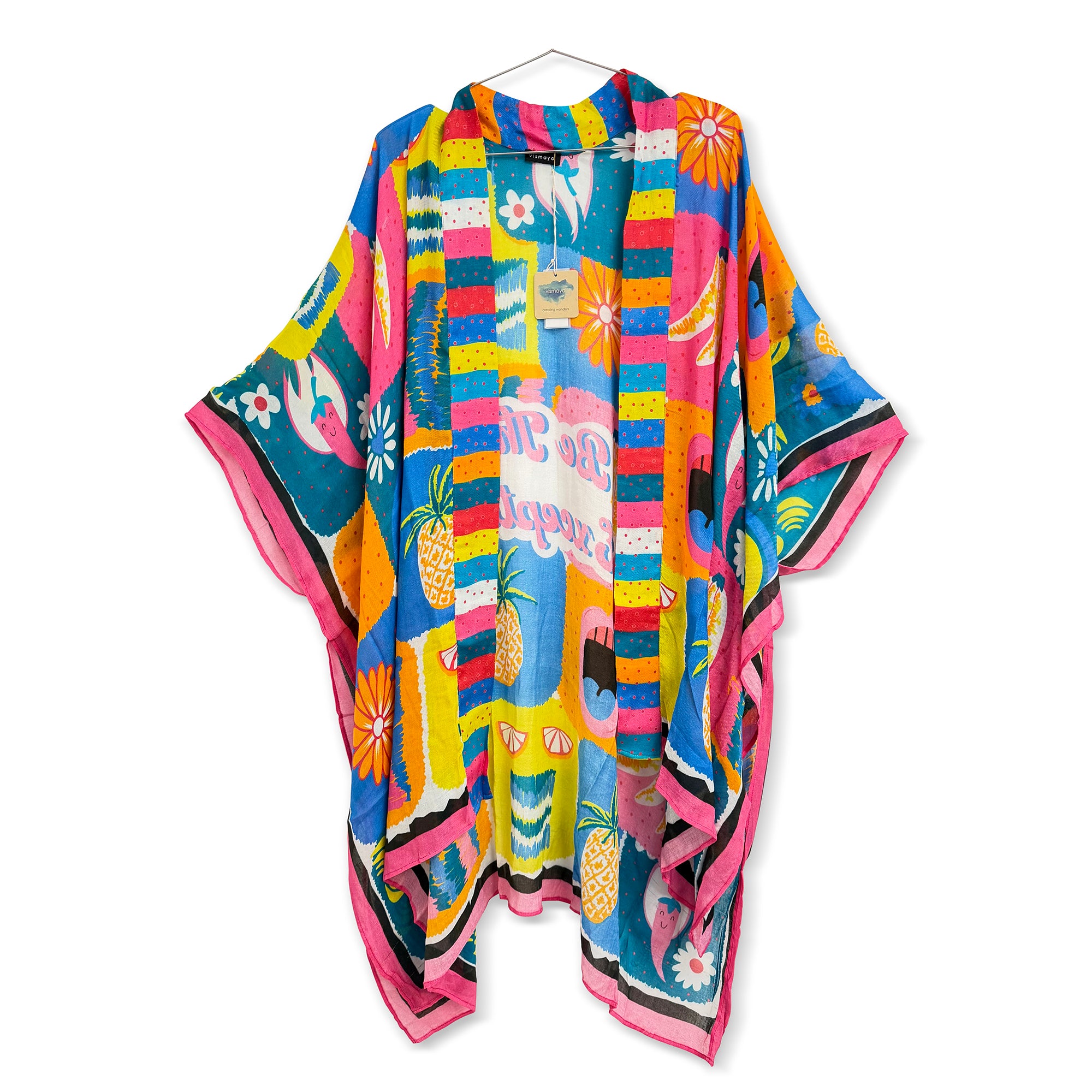 Make a bold statement with this colorful kimono cover-up, bursting with tropical flair. The lively design features pineapples, florals, and playful motifs in vibrant shades of pink, teal, orange, and yellow, framed by a chic pink border.