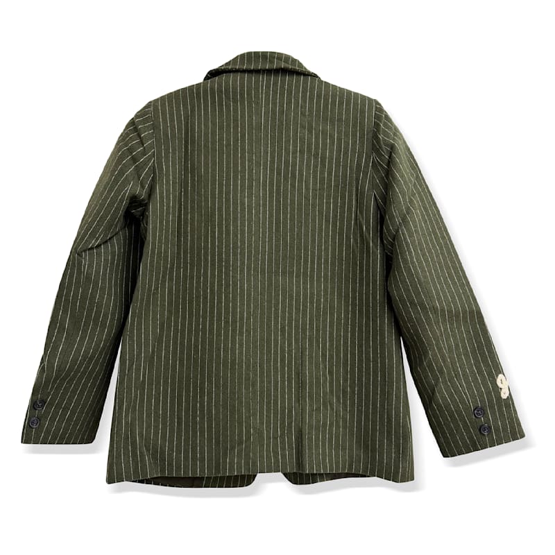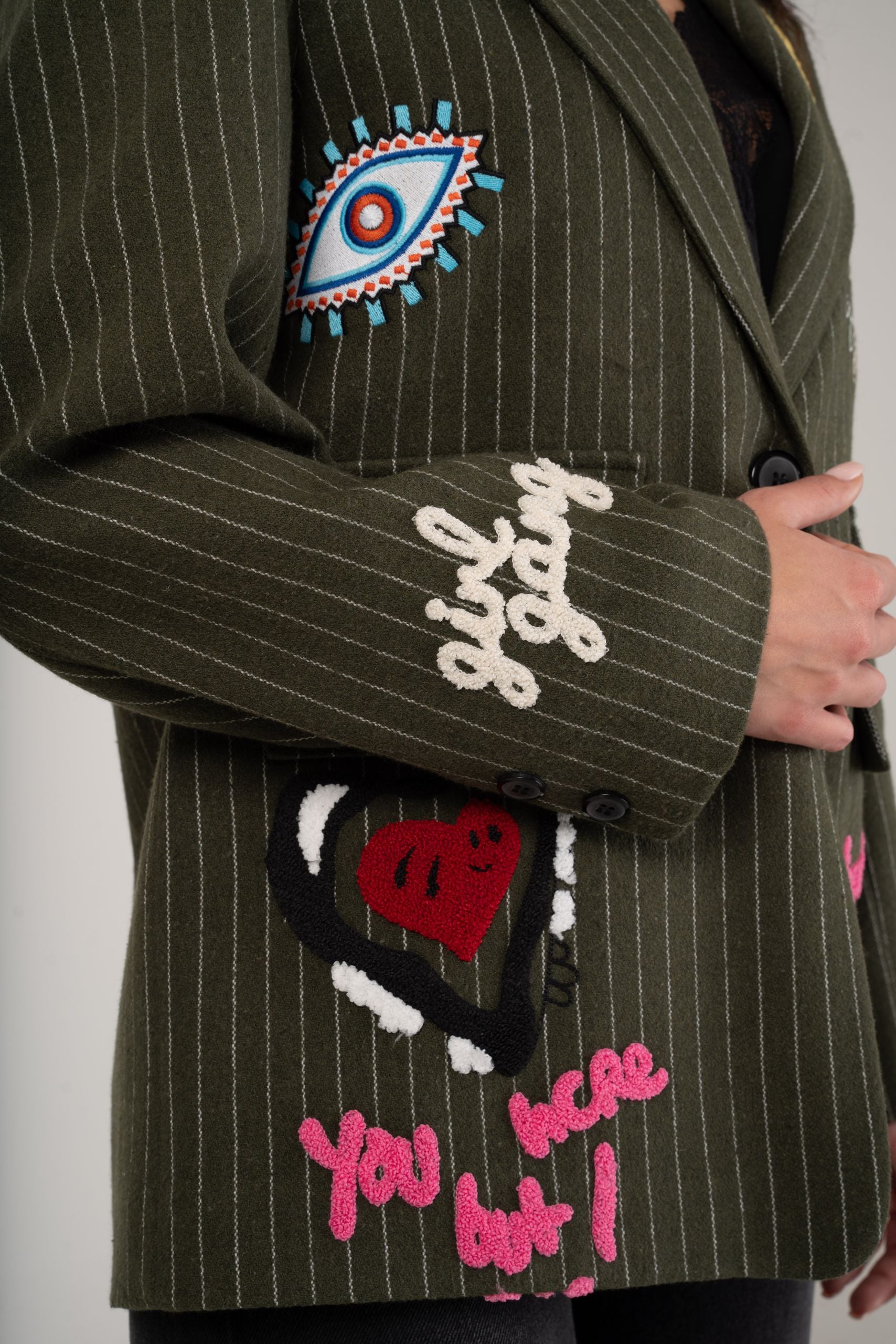 Classic tailoring meets bold expression in this olive-green pinstripe blazer. Hand-finished embroidery—featuring a striking eye, a playful heart, and textured lettering—transforms the piece into a statement of individuality. With its sharp silhouette and artful details, it’s the perfect balance of polish and personality, ready to elevate both day and night looks.