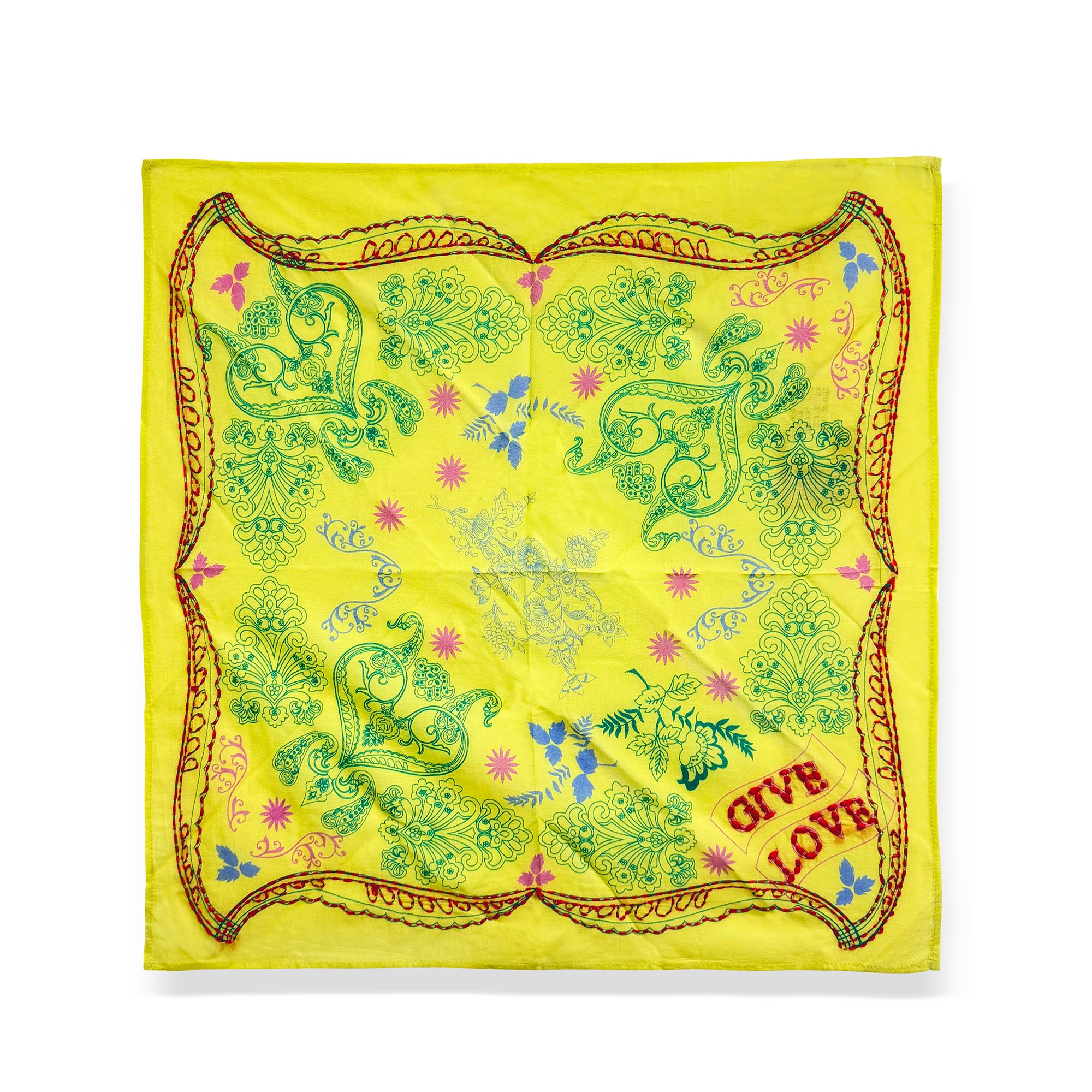 The "Give Love" Scarf is a vibrant lemon green color with contrasting fuchsia detailing. Intricate teal heart and floral motifs float through the scarf, accented by soft lavender and pink details. Lightweight and versatile, wear it as a scarf, bandana, bracelet, neck accessory, bag accent- the options are endless!