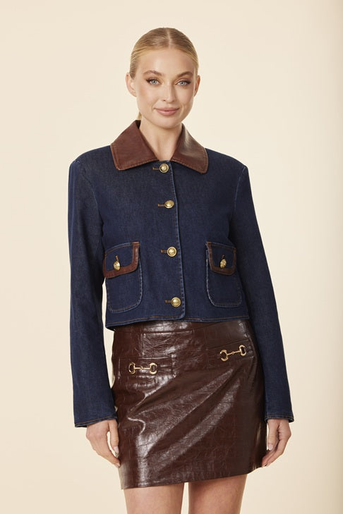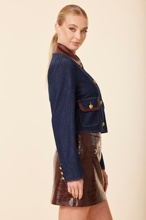 Modern sophistication meets vintage charm in this cropped denim jacket with rich vegan leather accents. Designed with a structured silhouette, it features a contrasting brown vegan leather collar and pocket trims that elevate its classic denim base. The front showcases bold gold-tone buttons and two flap pockets for both style and function.