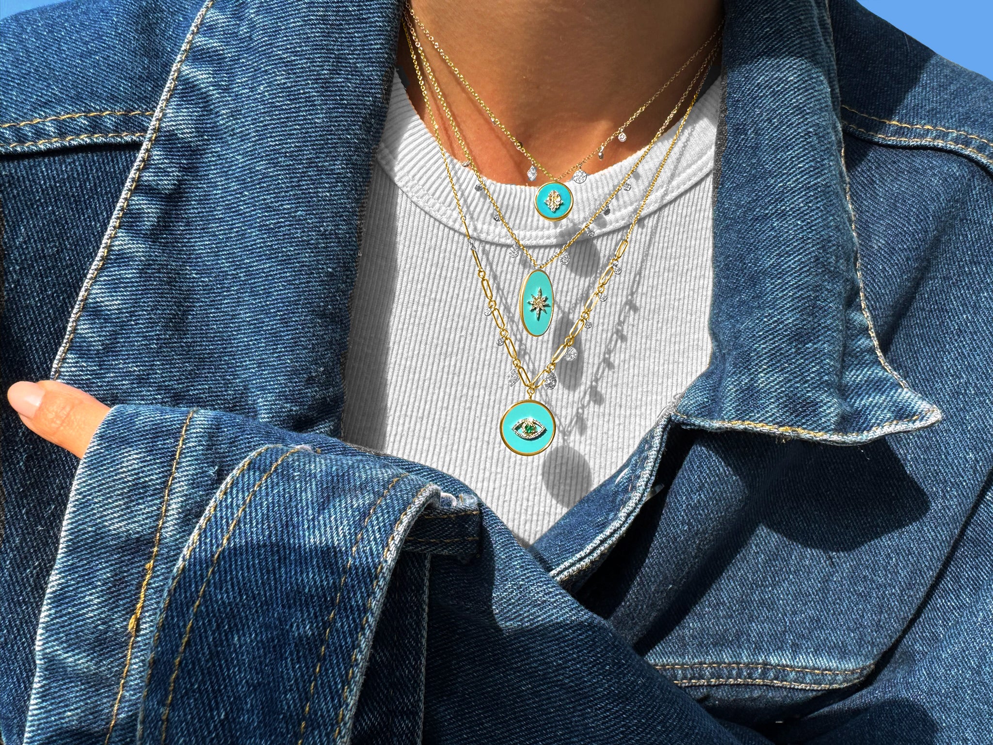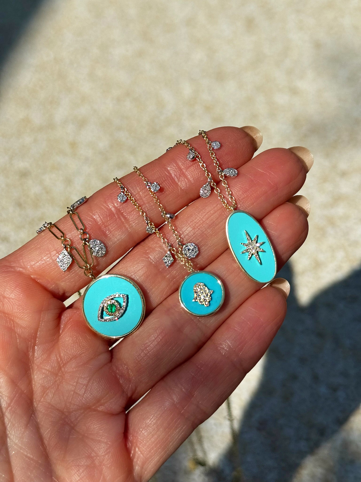 A perfect blend of elegance and edge, this 14k gold necklace features asymmetrical charms set with natural diamonds, creating a unique, sophisticated design. The turquoise adds a pop of color and is complimented by a diamond starburst.