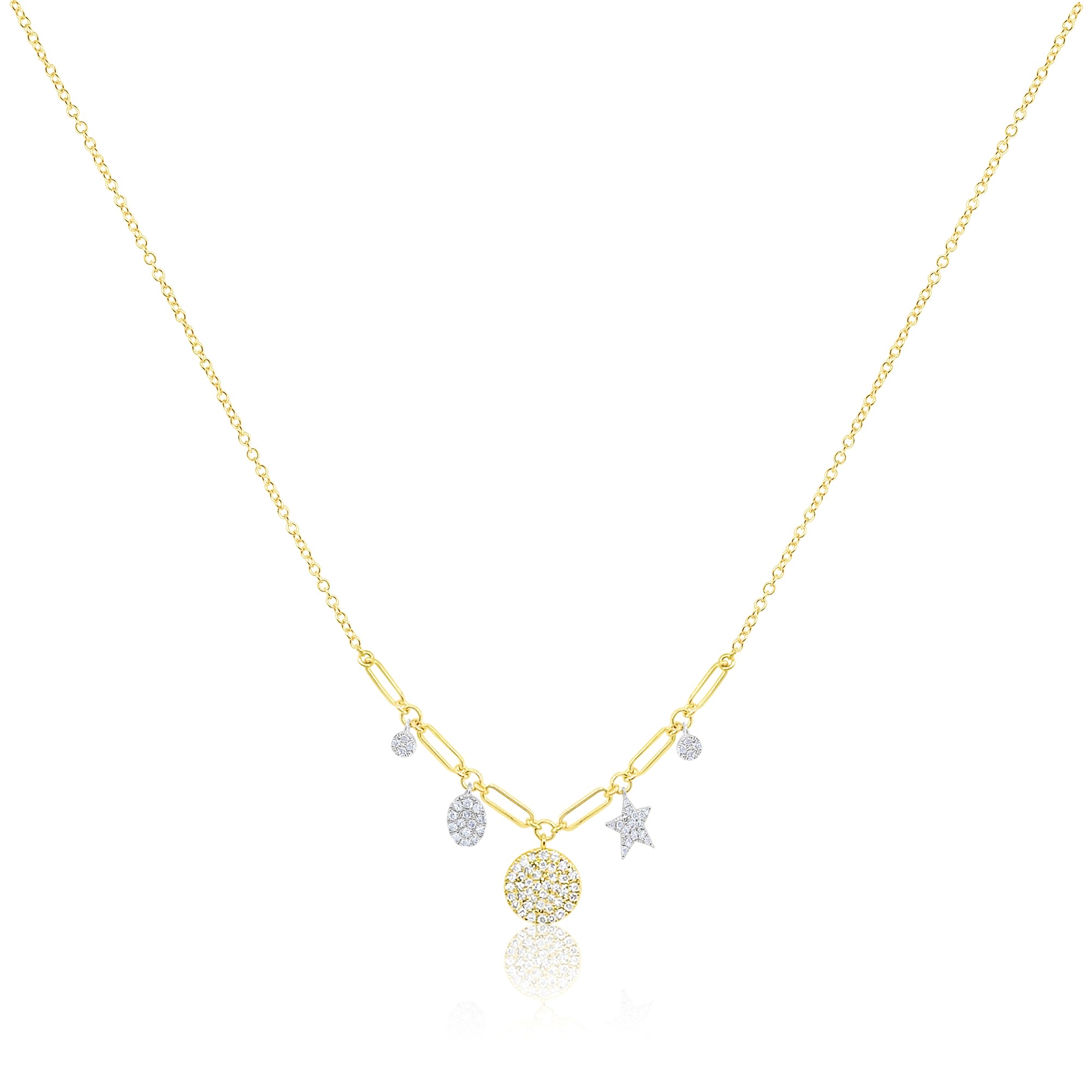 Elevate your jewelry collection with this refined 14kt yellow gold necklace, featuring delicate diamond charms that catch the light with every movement. The warm glow of yellow gold pairs beautifully with sparkling diamonds, creating a piece that transitions seamlessly from everyday elegance to special occasions. Each charm adds a touch of luxury and personalization to your look. Perfect for those who appreciate timeless sophistication and fine craftsmanship.