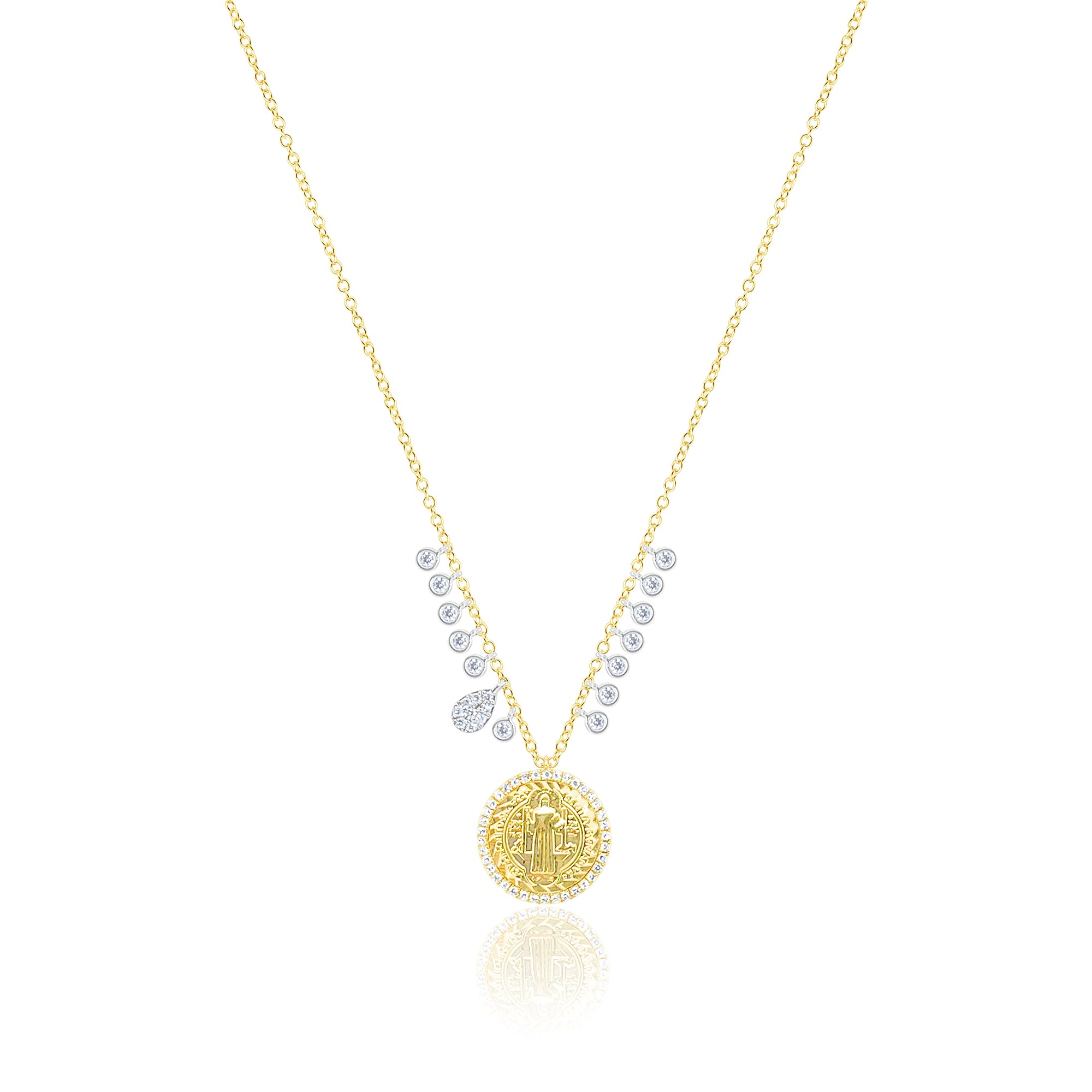 This elegant 14kt yellow gold necklace seamlessly blends timeless sophistication with contemporary design. Featuring a lustrous coin pendant adorned with sparkling diamonds, it captures light beautifully while maintaining refined understated elegance. The substantial weight and quality craftsmanship of 14kt gold ensure lasting durability and lasting value. Perfect for elevating everyday wear or making a statement at special occasions, this piece embodies luxury that transcends trends. An investment in enduring style and quality