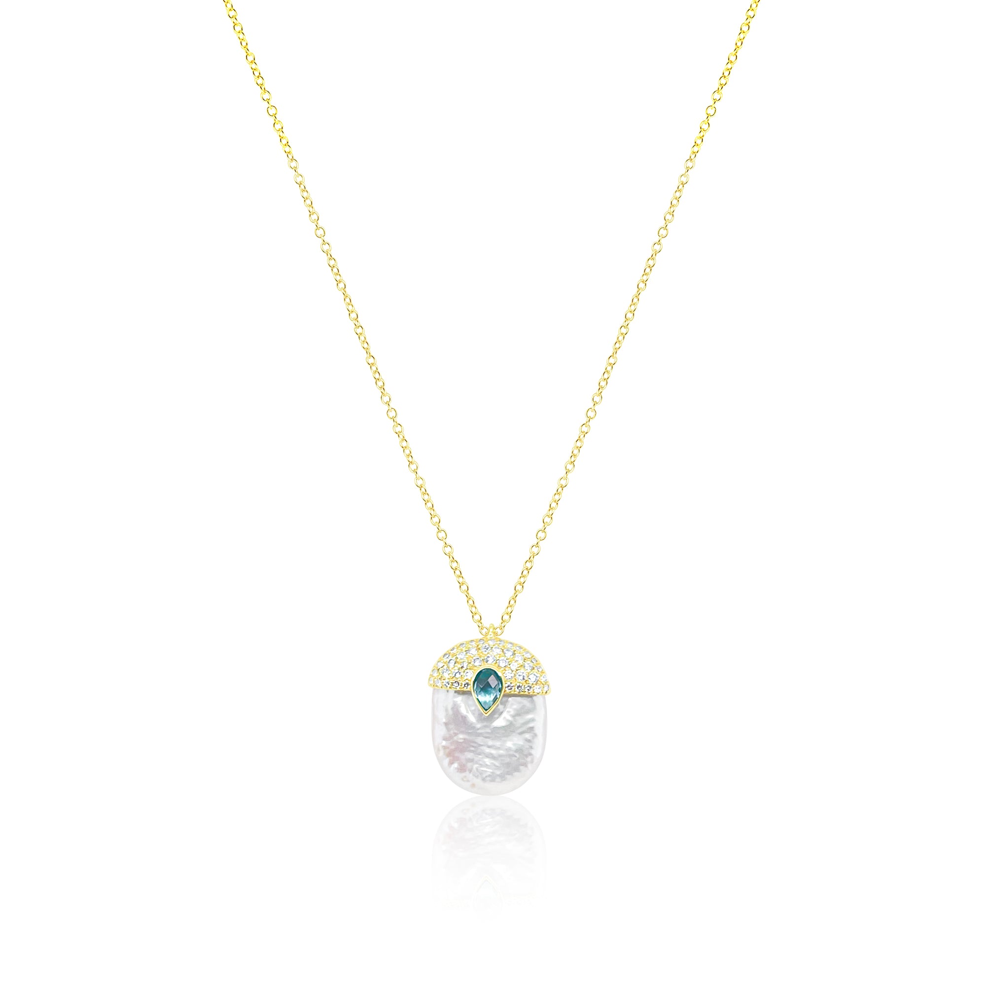 Elevate your jewelry collection with this refined pendant necklace, crafted in lustrous 14kt yellow gold. The design harmoniously combines the timeless elegance of a lustrous pearl with the brilliant sparkle of diamonds and the serene blue of topaz gemstones. This sophisticated piece transitions seamlessly from daytime elegance to evening glamour, making it an essential addition to any discerning jewelry wardrobe. Perfect for special occasions or as a meaningful gift for someone truly exceptional.