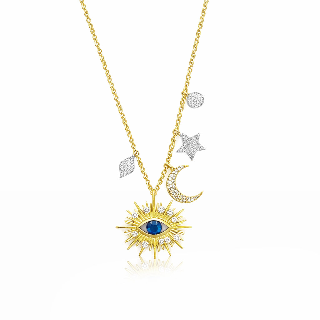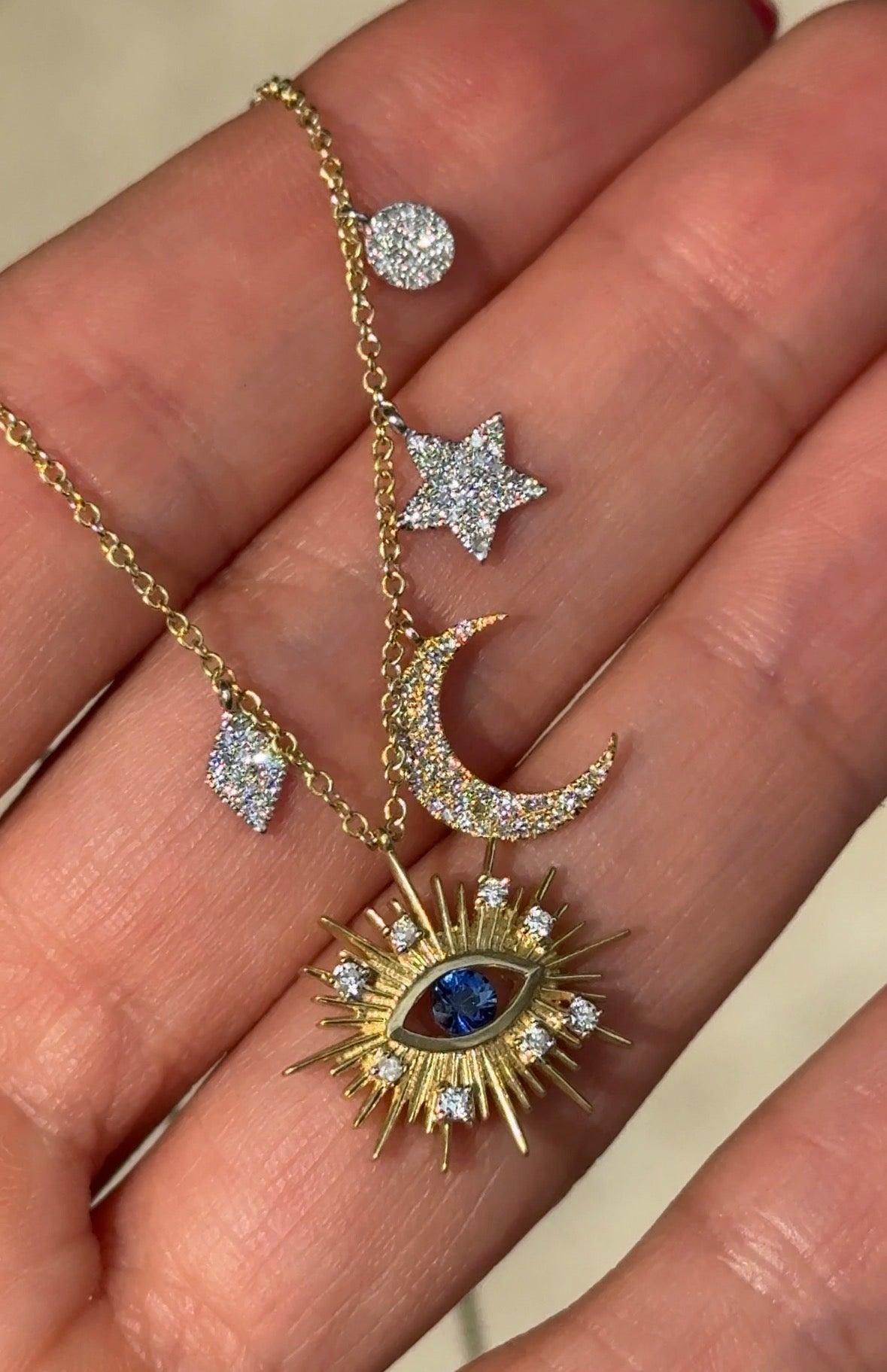 This exquisite one-of-a-kind necklace features a stunning blue sapphire at its heart, cradled in lustrous 14k yellow gold and adorned with sparkling diamonds. A crescent moon accent graces the side, adding celestial intrigue to this sophisticated design. Each piece is uniquely crafted, making it a truly singular treasure for those who appreciate distinctive, artisanal jewelry with timeless elegance.