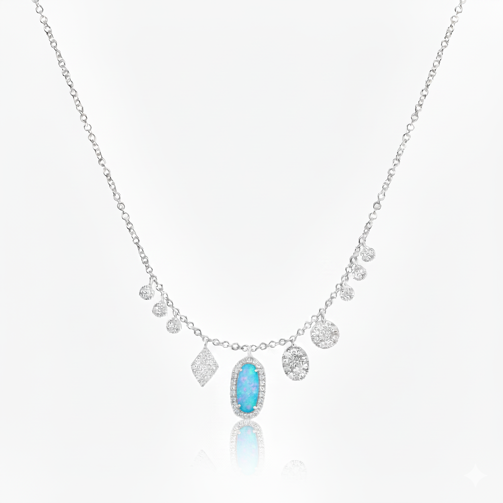 Elevate your jewelry collection with this refined 14kt white gold necklace, where brilliant diamonds frame a captivating blue opal centerpiece. The cool luminescence of white gold complements the opal's ethereal play of color, creating a piece that transitions seamlessly from day to evening wear. Perfect for those who appreciate understated elegance and timeless design, this necklace combines precious materials with sophisticated craftsmanship for a truly distinctive accessory.