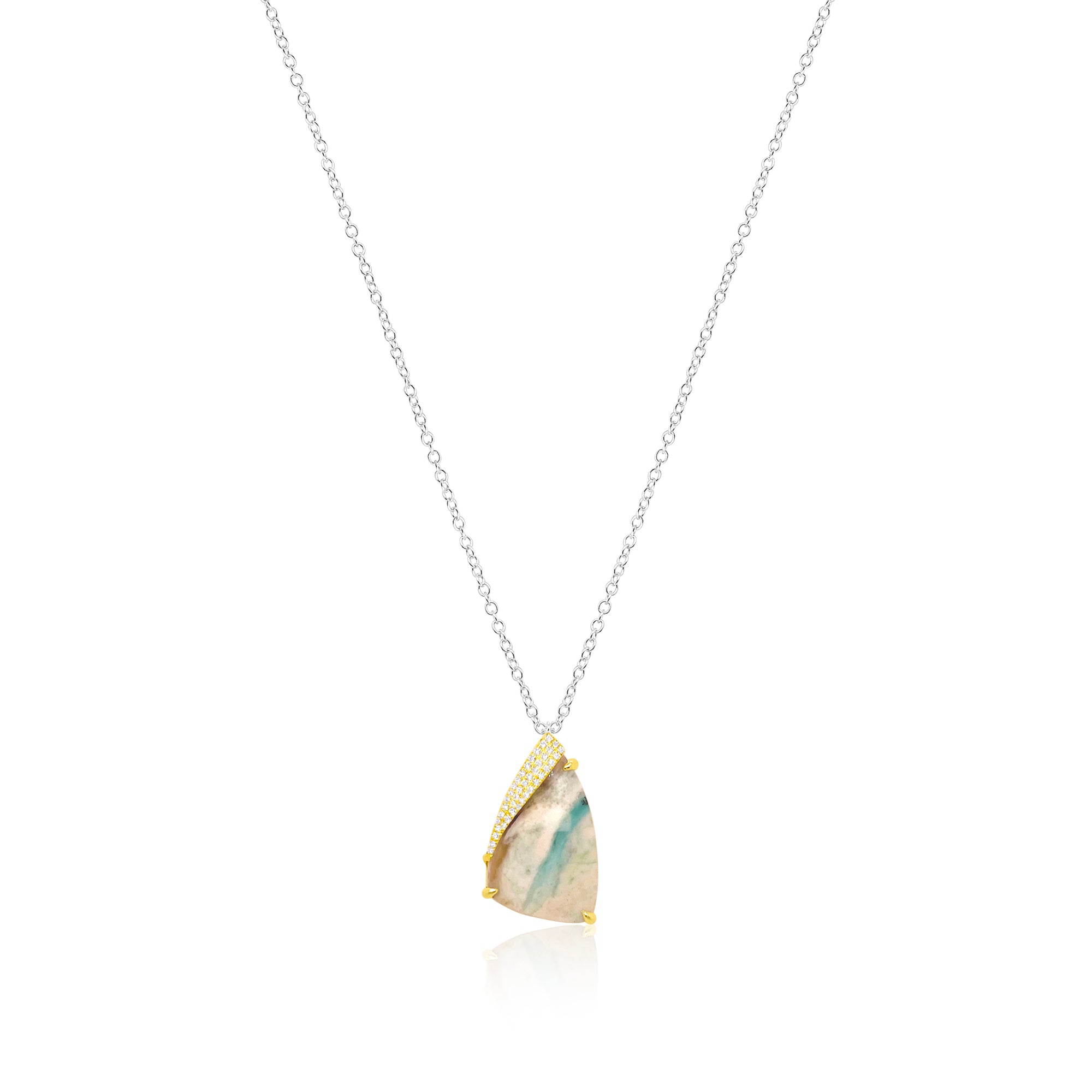 14kt White Gold Two Toned Diamond and Opalized Wood Pendant Necklace