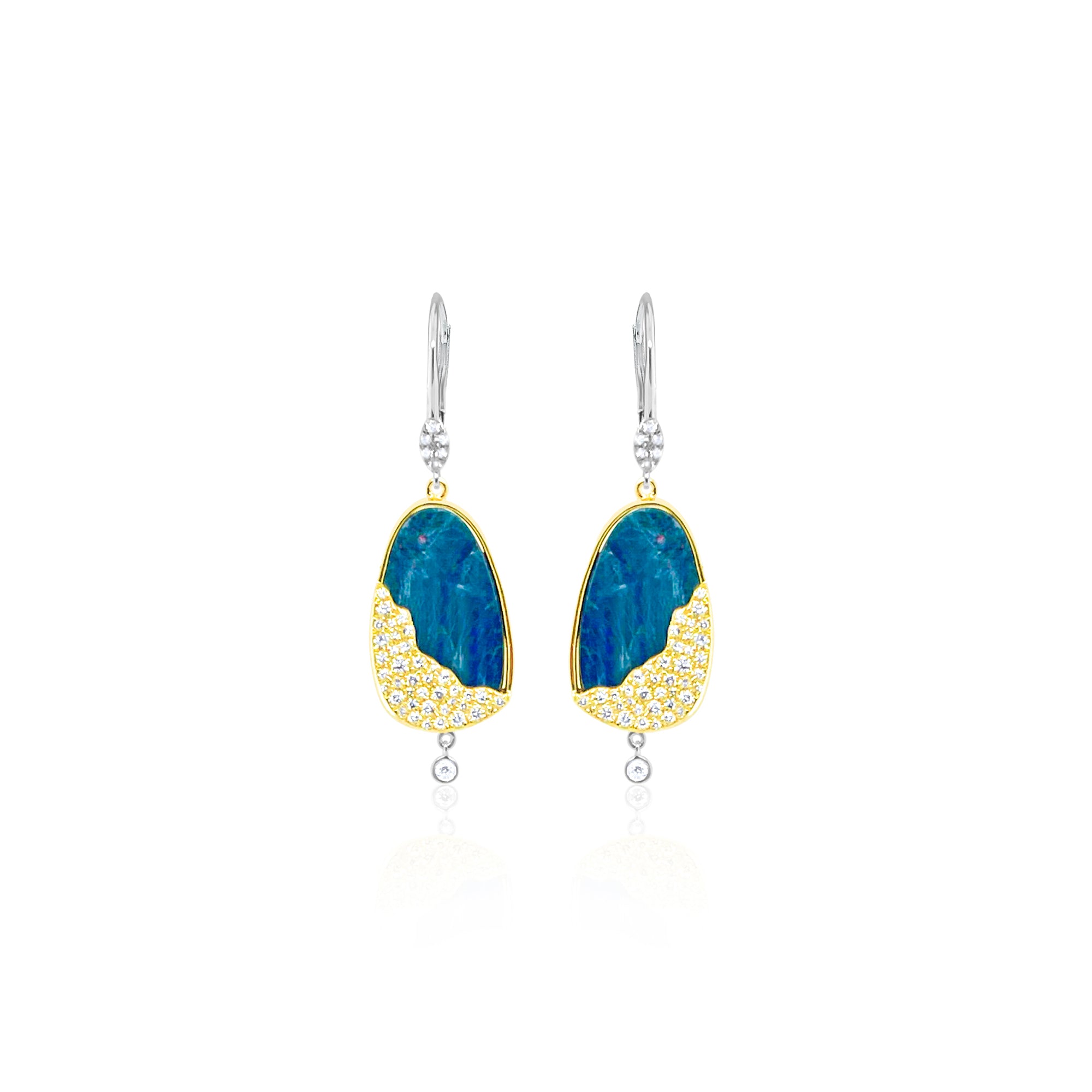Featuring a central opal set in silver, these leverback earrings are crafted in 14k two tone gold and elegantly accented with diamonds.