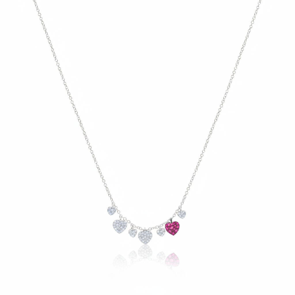 This necklace is crafted in 14k white gold and features diamond encrusted heart charms.