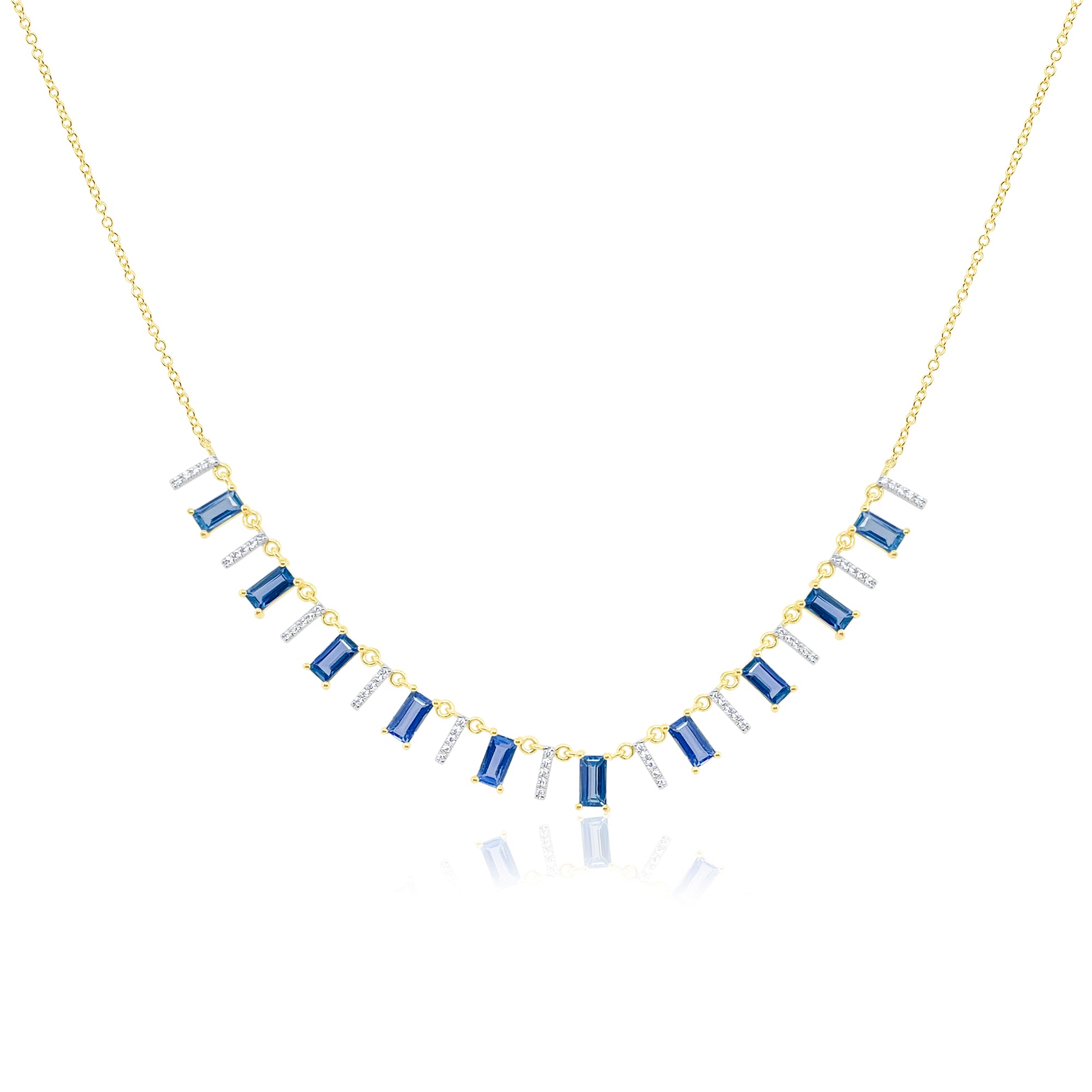 Elevate your elegance with this 14kt yellow gold necklace, expertly crafted to showcase stunning sapphires accented by sparkling diamonds. Its refined design offers a timeless statement piece that enhances any outfit, providing a perfect balance of luxury and subtle sophistication for special occasions or everyday grace.